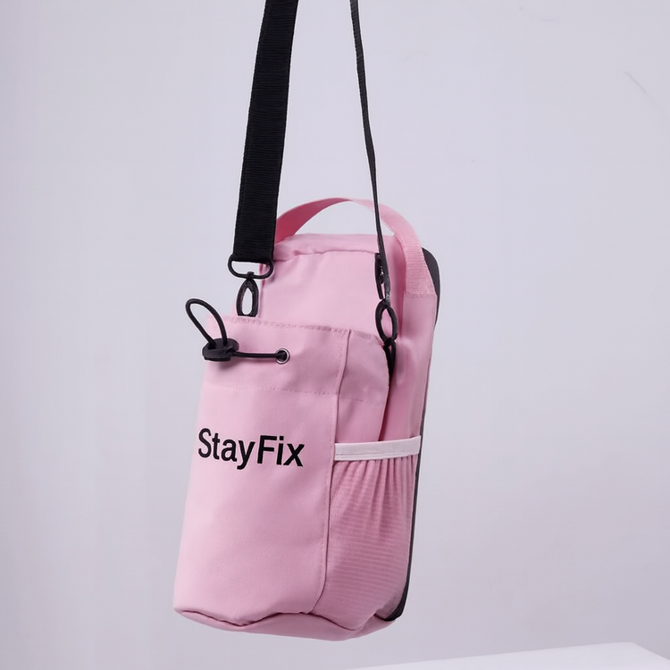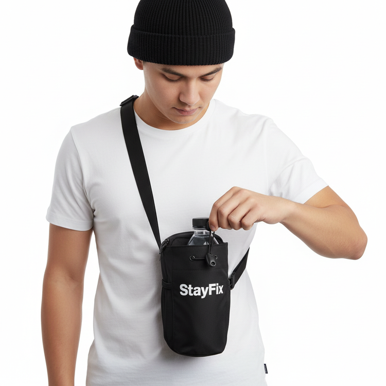 StayFix is sized to accommodate most 500 ml to 1 L water bottles, with an adjustable drawstring for a snug fit.